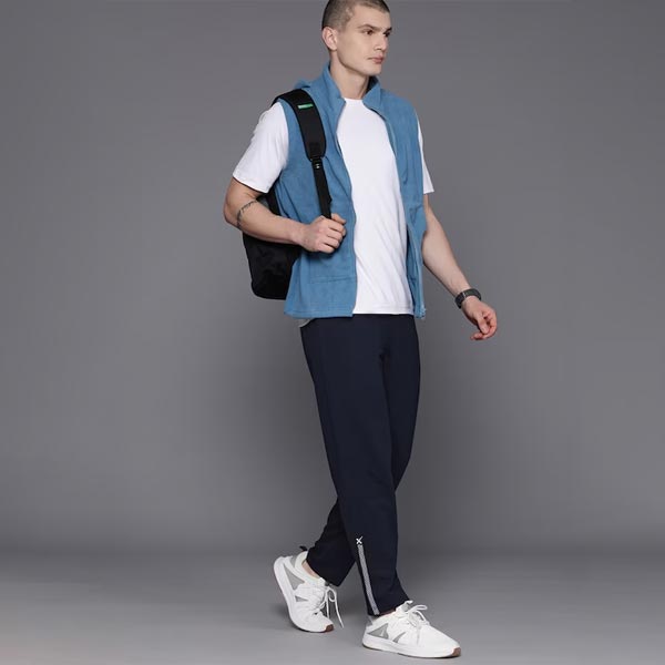 Track pantsBavy blue solid track pants, has an elasticated waistband with inner drawstring closure, 2 side pockets, regular length